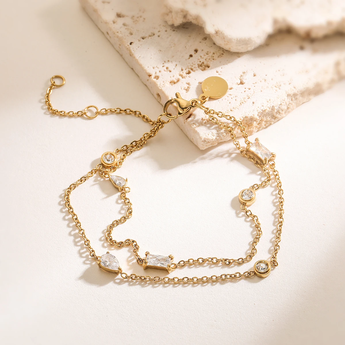 Let every step you take be a graceful dance of light. The Starlight Cascade Bracelet is designed to add a delicate, unexpected sparkle to your every move. Two fine, gold-plated stainless steel chains drape elegantly, one adorned with round solitaires and the other with chic, baguette-cut crystals. The modern mix of shapes creates a unique constellation of light around your wrist. It's a beautiful celebration of your journey and the radiant path you walk.